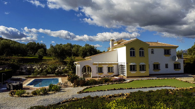 EXCLUSIVE WITH VILLASOLUTIONS - Villa el Encanto is a very unique and impressive property with 100% privacy, in a prime location with uninterrupted views of Lake Vinuela and Mount Maroma. To access the property you have electric gates and a very good printed concrete driveway leading down to the house. The house is a quality build and is finished to the highest standard with vaulted ceilings, large glazed panels, a new kitchen, split level lounge and gallery. The plot is 7,000m2 with lots of rock features, seating areas, palm, olive and fruit trees. There is parking for several cars and also a large car port. The swimming pool is 10 x 5m2 with lots of terracing around it for sun loungers. Inside, the house consists of an entrance hall with impressive high ceilings, a new and quality kitchen with dining area, integrated units, appliances and granite work tops. The lounge is spacious with AC, a gas fire and doors out onto an arched covered terrace with views to the pool area. On this level there are two double bedrooms with fitted wardrobes, AC and their own en suite bathrooms. Up the marble staircase there is a mezzanine floor which is currently used as an office and extra sleeping area. The master bedroom is also located on this floor and has its own ensuite bathroom and private terrace with magnificient views of the lake and mountains. This is an impressive property which really does have the wow factor around every corner!!