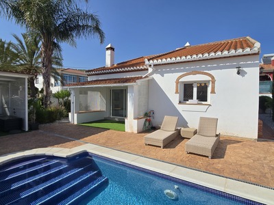 EXCLUSIVE LISTING : Villa Llamedos is a stylish, convenient, 3 bedroom, 2 bathroom, beautifully reformed one level property, modern both internally and externally. Located on a small, urban development, the plot is fully walled and gated with off road parking and has been finished with raised borders, palm trees, terraced walk ways, printed concrete terrace and a large shaded area for seating. The pool is a standard 8 x4 and there is a roof terrace to enjoy the mountain views. Inside is very light and spacious with new marble effect floor tiles, the lounge diner has sliding UPVC double glazed doors onto the pool terrace. The kitchen is new with a quality finish and is open plan off the lounge area. The 3 bedrooms are all of a good size with fitted wardrobes and the master bedroom has an ensuite shower room with his and hers sink. This property will not be on the market for long and will suit anyone looking for a completely reformed and finished to a very high standard villa in a popular location. Price is FIXED but includes all furniture as seen.