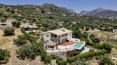 PRIME PROPERTY - Villa La Herriza is a unique and immaculate 4 bedroom 4 bathroom property nestled in the Alcaucin Valley, just above Venta Baja. Located at the end of a no through track with magnificent south facing views across the valley toward Mount Maroma. The villa sits on 2 plots, which are fully fenced and filled with trees, pathways, rockeries and beautiful gardens. There are 3 sets of entrance gates with the main one having automatic electric gates to a large parking area and garage with automatic door and small workshop. There is a large 10 meter salt water, heated swimming pool with terracing around it for sunbathing. Beside the pool is an attractive pergola, ideal for dining in the shade in the hotter months. On the ground level you have a self contained apartment with 2 bedrooms, 2 bathrooms, lounge and kitchenette with all modern extras. The lounge has AC, a wood burner, central heating and patio doors to a glazed and covered terrace. The 2 bedrooms are a good size with AC and central heating. There is a general bathroom and an ensuite shower room with separate sauna. You access the main living area via a marble staircase into the lounge which is very light with a vaulted ceiling, large panoramic window and patio doors to a covered terrace. The kitchen is very modern and light with plenty of units, a central island and a separate utility room. The 2 bedrooms on this floor are doubles with AC and central heating. The master bedroom has an ensuite shower room and there is also a general shower room. The house is fully alarmed and all of the windows are tilt and turn, double glazed with mosquito nets. This really is a must see, turn key opportunity to buy a very special home in a peaceful and tranquil part of Andalucia.